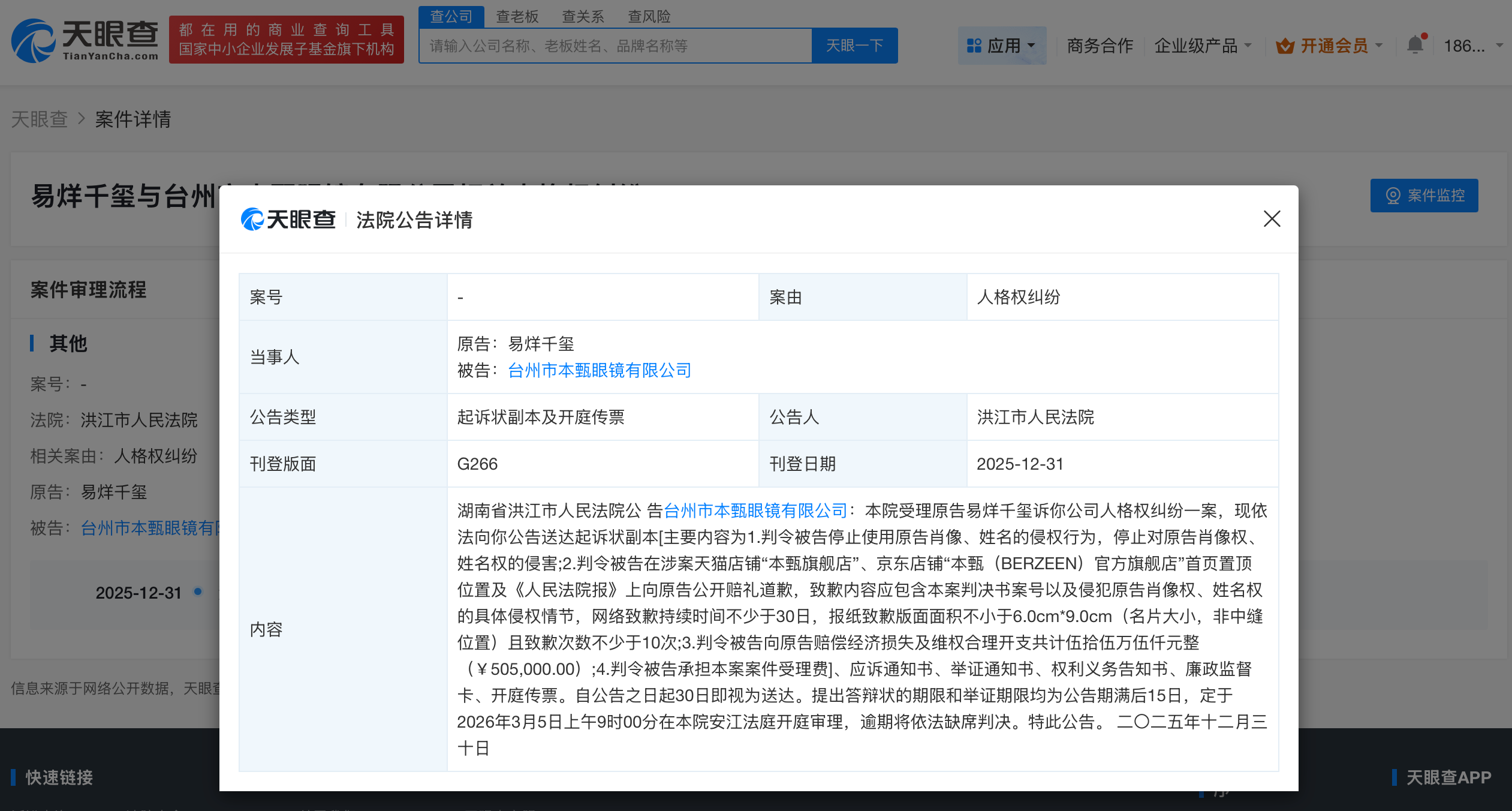 天眼查天眼风险信息显示,近日,洪江市人民法院向台州市本甄眼镜有限公司公告送达原告易烊千玺与其人格权纠纷一案起诉状副本及开庭传票等,自公告发出之日起经过30日即视为送达。该案将定于2026年3月5日开庭审理。