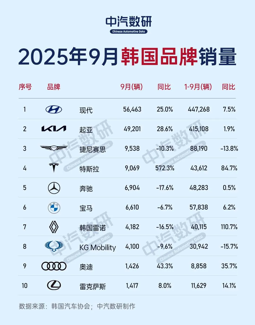 2025年9月,韩国新车销售量达15.75万辆,同比增长20.8%。其中,本土品牌销量12.47万辆,同比增长18.1%;进口品牌销量为3.28万辆,同比增长32.2%。1-9月韩国市场累计销量1125.8万辆,同比增长5.1%。