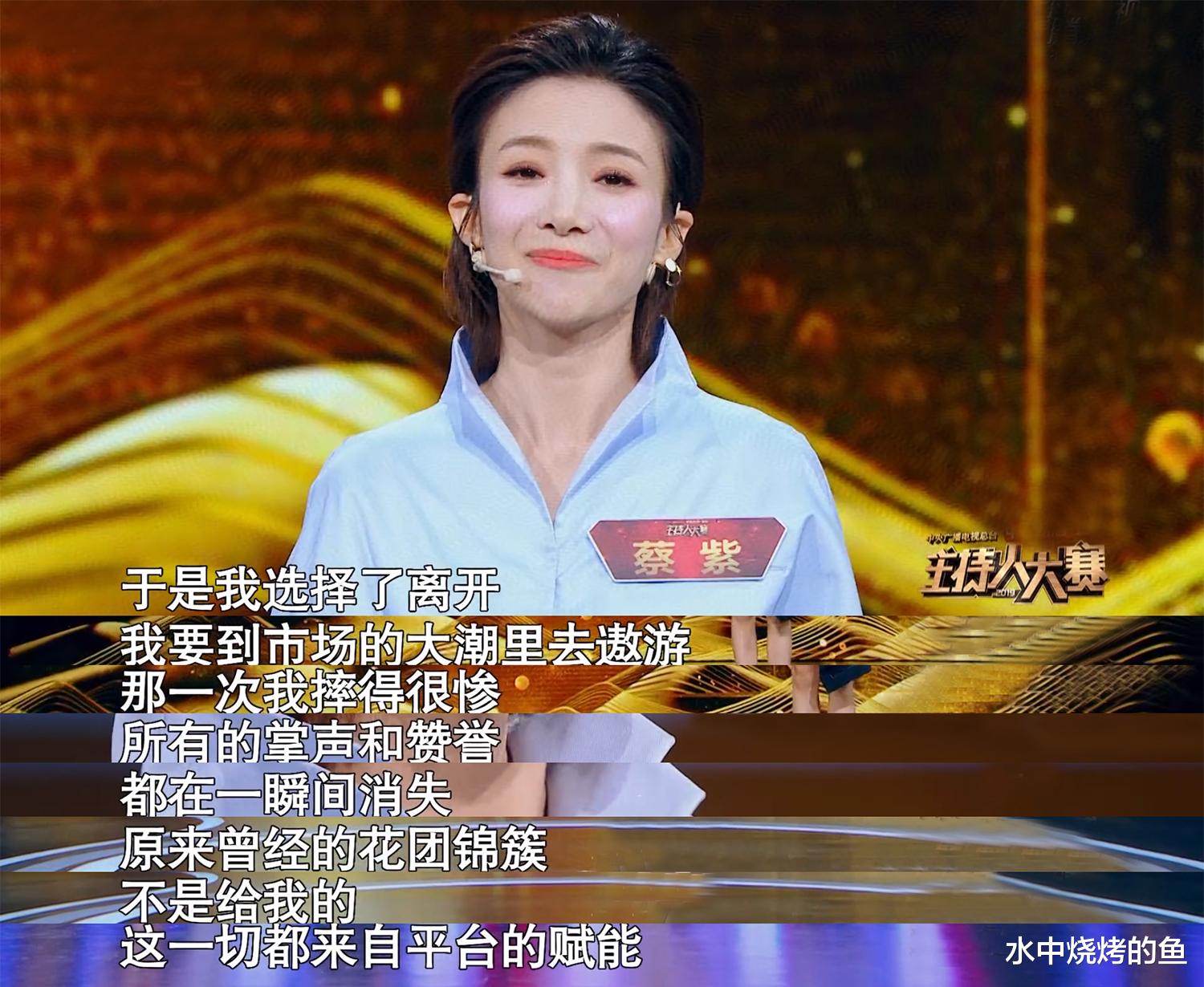 蔡紫在总决赛中曾表示,自己毕业后在北京卫视混得不错,后来选择去大潮里遨游,结果摔得很惨,离开北京卫视这个平台,所有的掌声和赞誉都在一瞬间消失,自己也成了被挑选的对象。