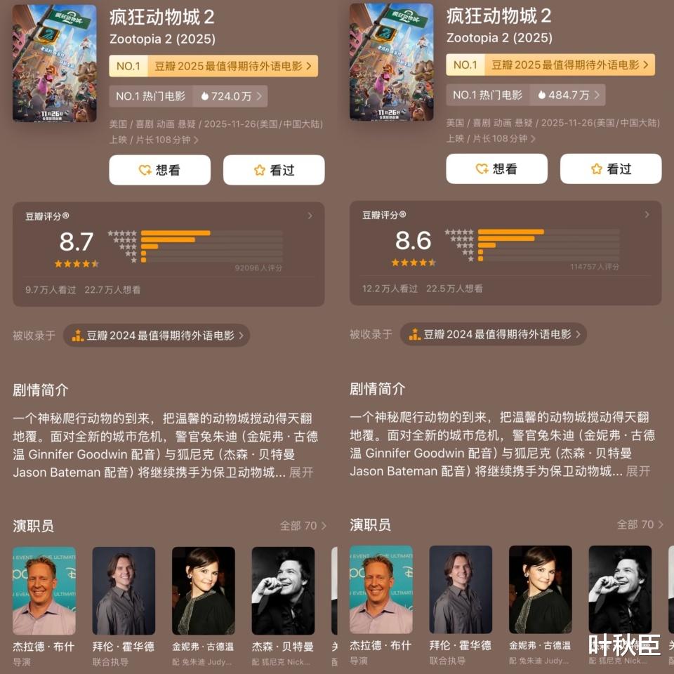 目前《疯狂动物城2》的豆瓣评分,已经从上映后开分的8.7分,下滑至8.6分。