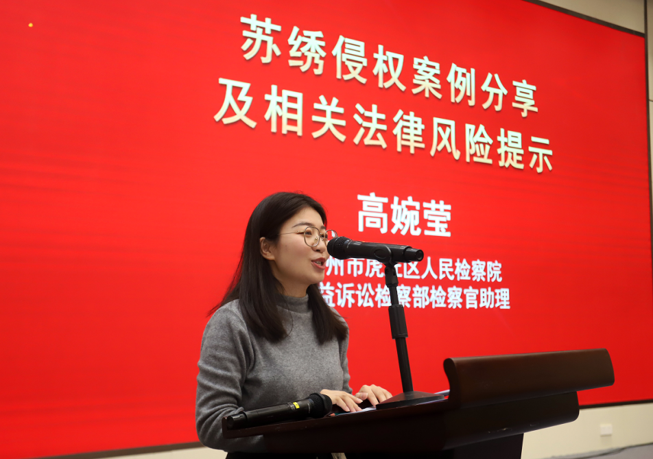 会议上,吴宏院长通过苏州互联网法庭的详细介绍,为苏绣从业者线上维权提供便捷路径;虎丘区人民检察院公益诉讼检察部高婉莹检察官结合典型案例,剖析苏绣侵权法律红线、讲解风险防范;高新区市场监管局网络合同监管处处长孙学勤则通过苏绣网络直播合规指引,为苏绣行业送上经营“合规锦囊”。从“找问题”到“知途径”,从“懂法律”到“明规矩”,整场专题会干货满溢。会议号召全体行业从业者坚守匠心、尊重原创、守法经营、规范发展,共同维护好镇湖刺绣的金字招牌。