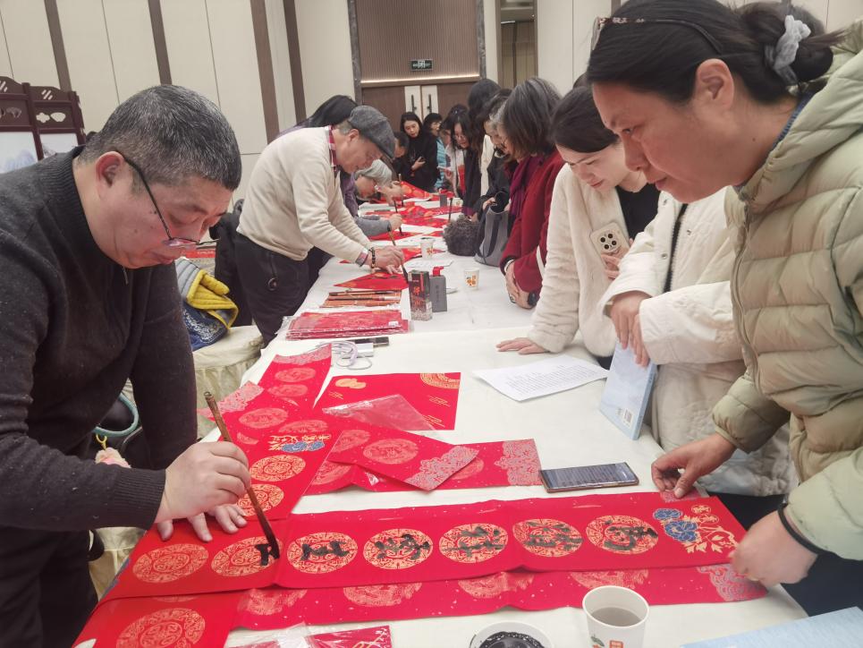 活动伊始,苏州市民间文艺家协会组织知名书法老师为参会代表书写春联福字。通过一笔一划写就的“文化年货”为过去一年匠心耕耘在织绣艺术领域的会员们送上新春的祝福,也为新一年的开启注入温暖而奋进的力量。