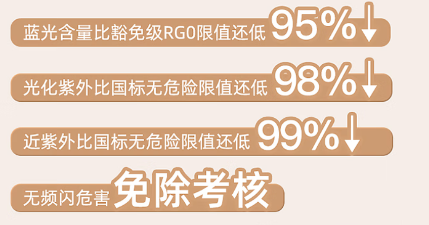 这款灯采用首尔Sunlike全光谱灯珠,依托品牌百年照明光学积淀打造紫光全光谱,有害蓝光峰值较RG0标准降低95%,达到RG0豁免级,光化紫外比国标无危险限值低98%,全方位规避蓝光损伤风险。