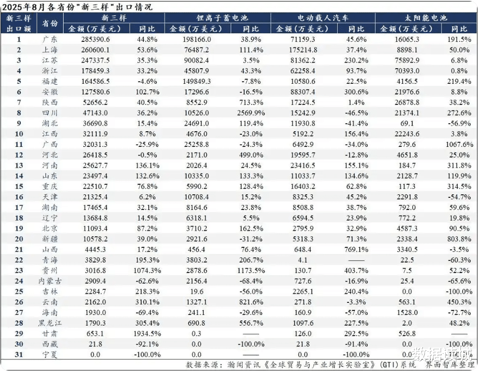 珠三角地区除了深圳领跑,广州、东莞、佛山在“新三样”方面都有布局,但差距非常明显。广州2025前三季度的“新三样”出口达172.6亿元,增长46.7%,9月单月增速冲到了93.3%,但占全市出口比重仅3%,依然是传统外贸为主,新动能还没完全起来。东莞上半年实现锂电池出口109亿元,增长42.7%。佛山2025上半年“新三样”出口11.3亿元,81%的增速看似凶猛,但基数太小。
