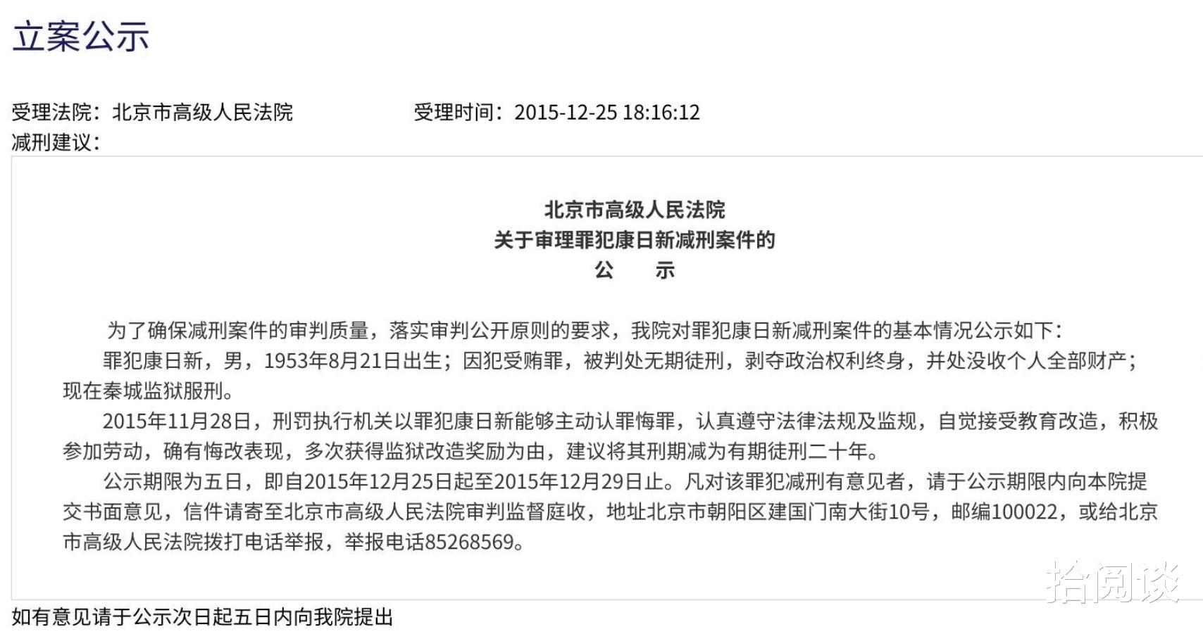 2016年,因为康日新认罪悔罪态度好,日常表现较好,被减刑至20年有期徒刑,剥夺政治权利10年。