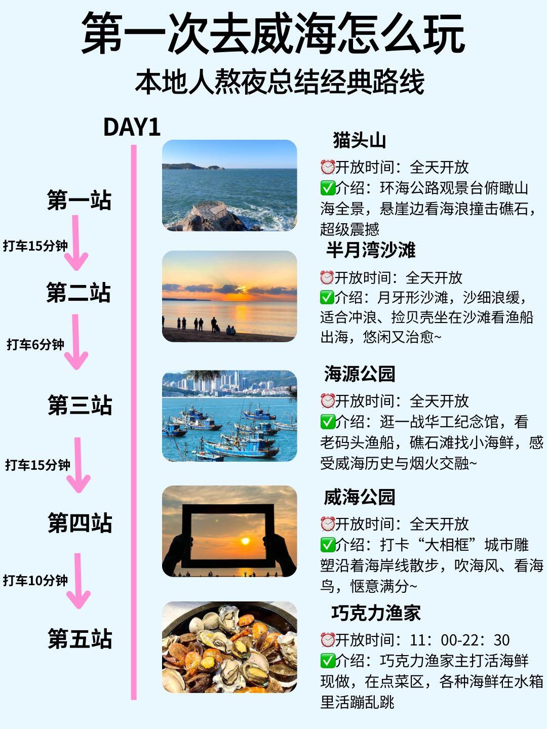 猫头山—半月湾沙滩—海源公园—威海公园—巧克力渔家