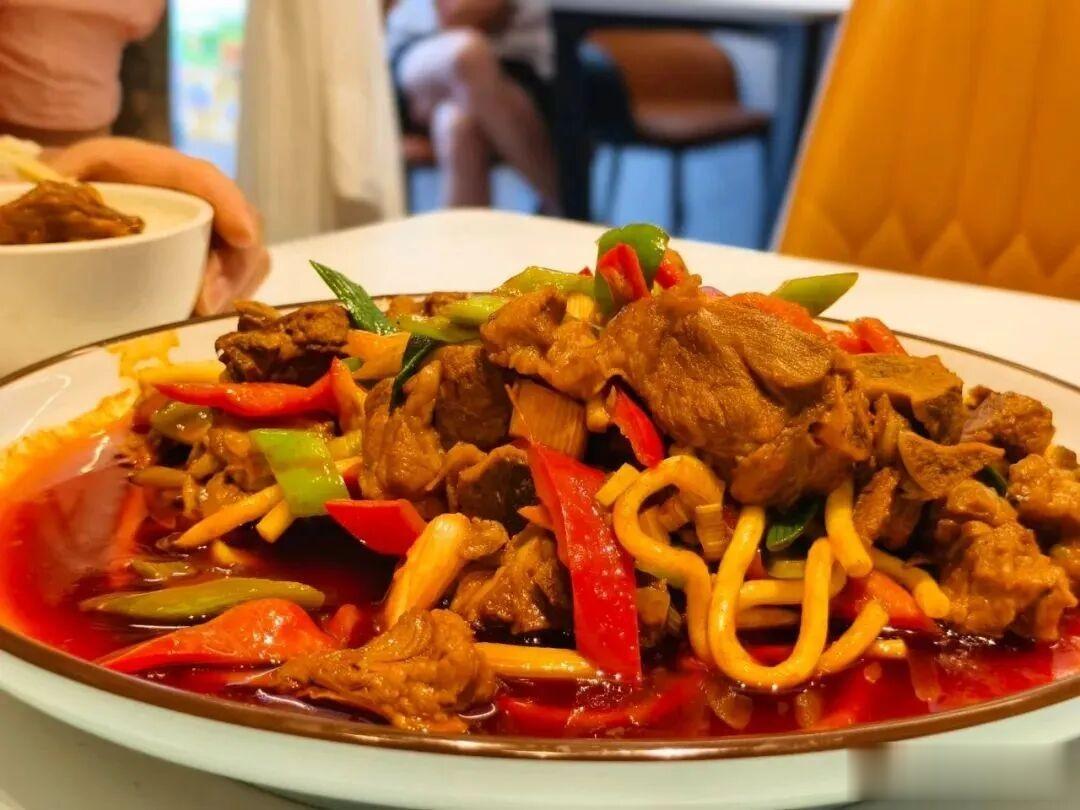 配料收汁:添入适量温水,边炖边炒1小时后,加入泡好的粉条、青红椒、洋葱、蒜苗、大蒜,撒上盐、糖和味精、辣椒面翻炒几下,收汁出锅。