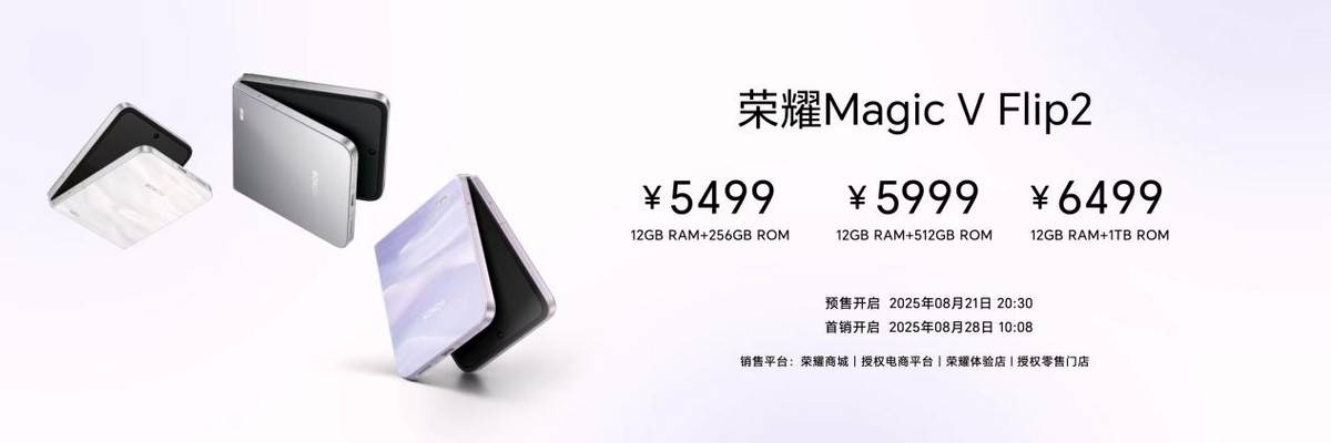 荣耀Magic V Flip2系列于8月21日在荣耀商城和各大授权电商平台开启预售,8月28日10:08正式开售。晨曦紫、月影白、钛空灰配色售价5499元(12GB+256GB)、5999元(12GB+512GB)、6499元(12GB+1TB),高定款售价7499元(16GB+1TB)。