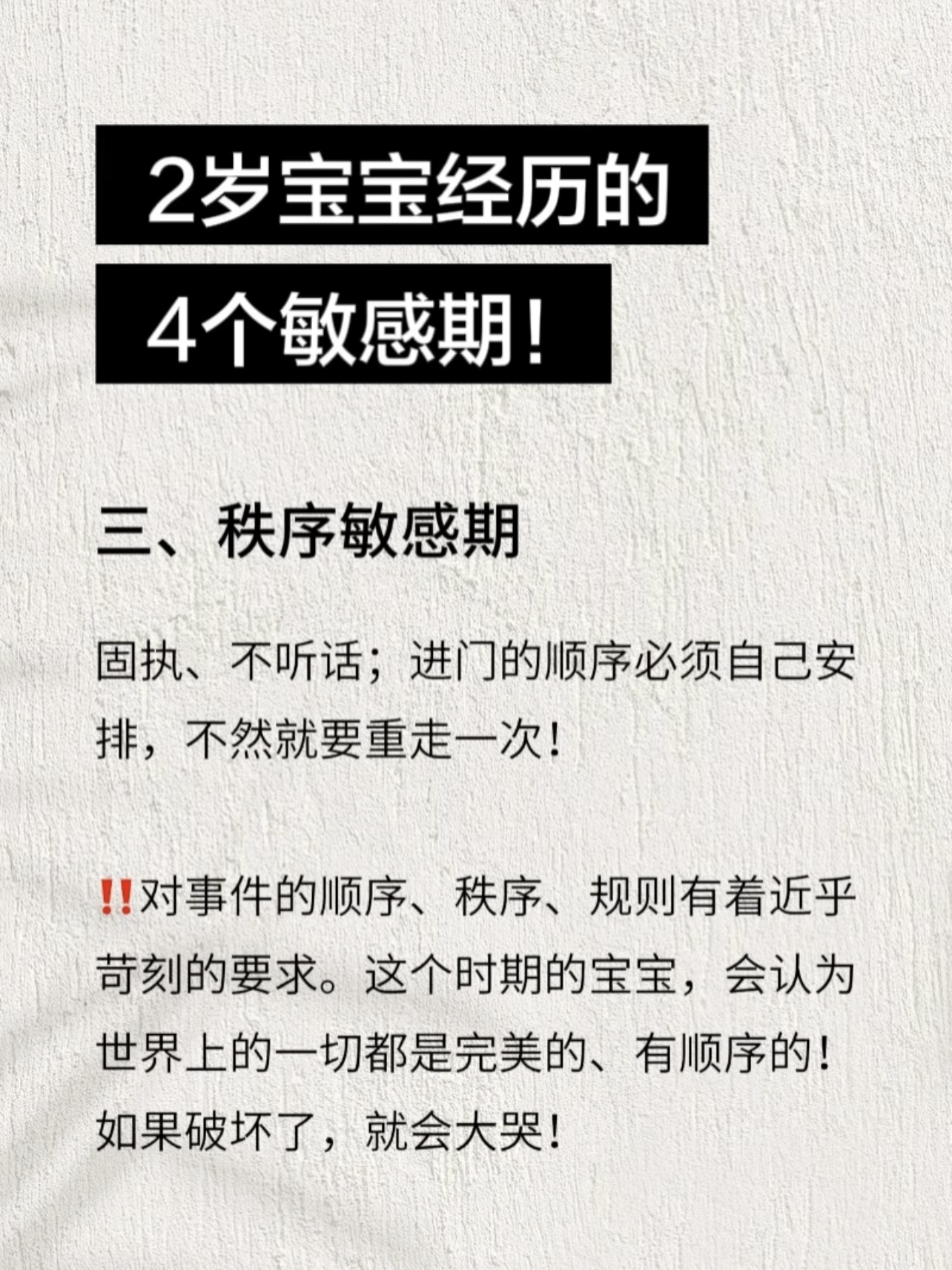 秩序敏感期:一切都得按规矩来,这个阶段的宝宝对秩序有着近乎执拗的坚持。家里的东西摆放位置变了,穿衣服的顺序不对,走路,都会让他们大哭大闹。有次我带孩子出门,平时都是先穿鞋再拿包,有次我着急,先拿了包再穿鞋,孩子立刻就不干了,非要我重新按顺序来。家长们要理解,秩序敏感期是孩子建立安全感的重要阶段。当周围的环境和事物都按照一定的秩序存在时,孩子会感到安心。所以,我们要尽量满足孩子对秩序的需求,保持家庭环境的稳定和规律。比如,每天固定的作息时间、固定的吃饭位置等。如果因为特殊情况需要打破秩序,要提前和有心理准备。