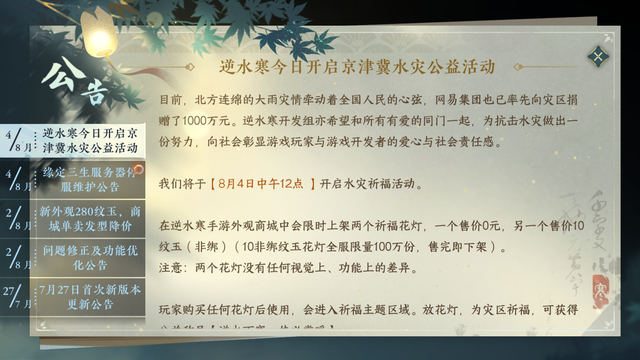 2023年游戏刚上线,因为京津翼地区因暴雨肆虐引起水灾,《逆水寒》手游就开始率先尝试在游戏内举行公益赈灾活动,通过公益售卖1元钱一个的祈福花灯,筹得100万元,项目组追加捐赠 200万元,将总计300万元专项款支援灾区重建。