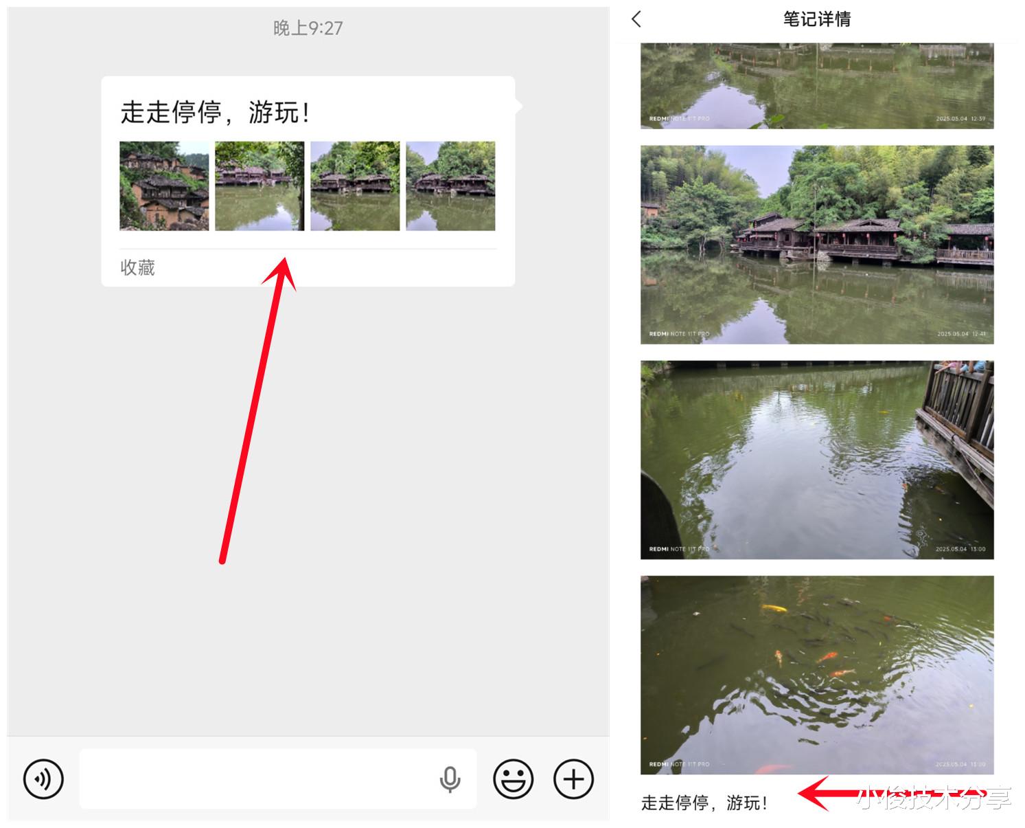 你看它点开之后,不仅上面有文案,而且图片还排列得特别整齐,直接这样一划,就可以直接把所有照片一下子就看完了,是不是,再也不用一个一个点开,省时又省力。有了这个功能之后,咱们在工作时要发发送一些重要文件,文档,也可以使用这种打包方法,把它们一次性发送出去,特别方便!