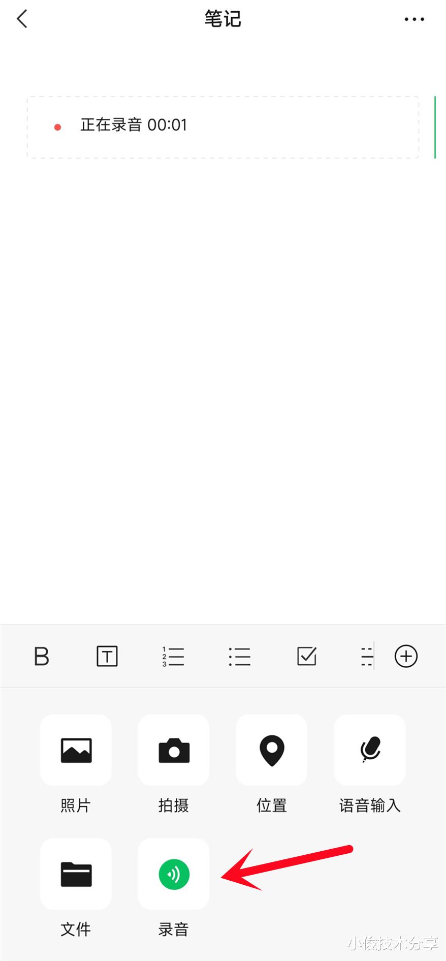 你看,咱们点一下收藏,点一下右上角加号,再点右下角的加号,这里就出现了一个录音按钮。大家看到了吧?如果这个时候你需要录音,你就提前点一下。