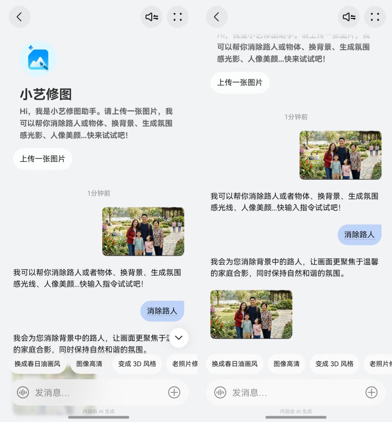 现在有了小艺修图智能体,一句话就能拯救废片。直接从图库打开图片,长按桌面底部导航条唤醒小艺,说出修图指令就行。或者直接唤醒小艺,进入底部发现/广场,点击右上角搜索“小艺修图”,然后把照片直接发进去说句“消除路人”,TA就精准抹除画面里的多余路人,还原干净的春日景致。说一句“生成春日油画风格滤镜”,平淡的照片瞬间变身氛围感大片,这种“对话式修图”,不是简单的调色,更像是有个懂审美的专业后期时刻待命,清明出游的每一张春日瞬间,都能轻松出片。