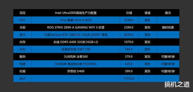 4、Intel Ultra200S高端生产力配置这套配置基于Intel 酷睿 Ultra 9 285K+ROG STRIX Z890-A GAMING WIFI S 吹雪主板+RTX 5080显卡打造而成,既能胜任2016P分辨率高特效下畅玩各类大型游戏,也能胜任各种视频剪辑、图形渲染、AI本地化大模型之类的生产力项目,综合实力非常强悍。