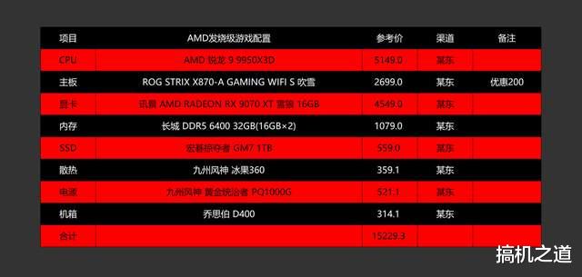 二、配置推荐1、AMD 高性能游戏配置虽然近期内存大涨,但AMD 9000系处理器和7000系显卡价格大降,下面这套配置基于AMD 锐龙 7 9700X CPU+华硕 TUF GAMING B850M-PLUS WIFI 重炮手主板+RX 9070 GRE显卡打造而成,游戏性能非常强悍,能够在1440P分辨率下畅玩市面上大多数游戏大作,也能在2160P分辨率玩转部分游戏。尽管内存涨了,但这套配置相较本人618时期的同等级配置价格还便宜500多,性价比很高。