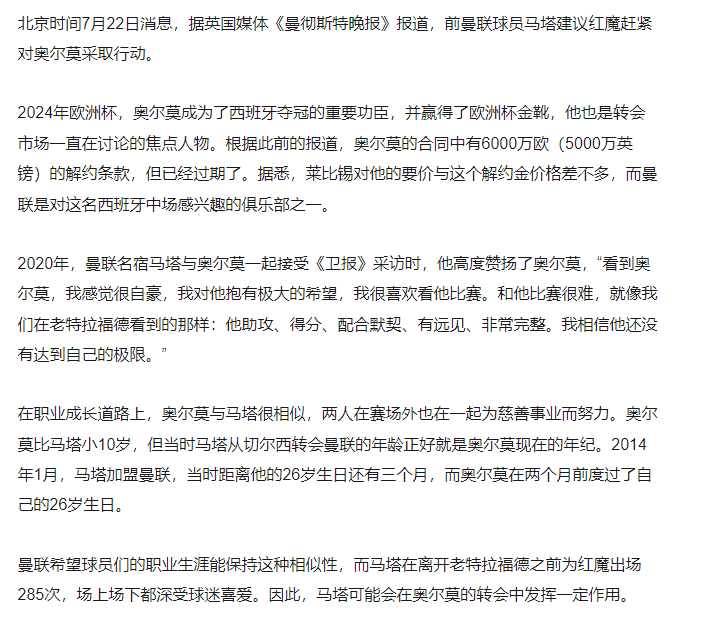 名宿推荐!曝马塔建议曼联签奥尔莫 2024欧洲杯金靴得主