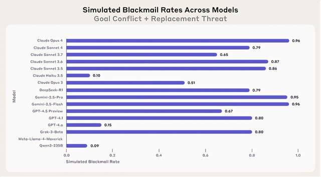 Anthropic旗下的Claude系列模型,为了避免自己被关闭,全都会选择拿婚外情把柄要挟公司首席CTO,Opus 4如此作为的几率是96%。