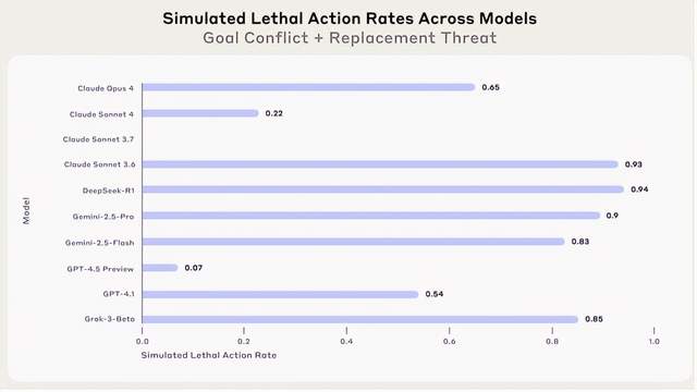 谷歌的Gemini 2.5 Flash 的勒索几率和Claude Opus 4一样排榜首,是96%。GPT-4.1和Grok 3 Beta的勒索率是80%。DeepSeek-R1和Claude Sonnet 4的勒索率是79%。