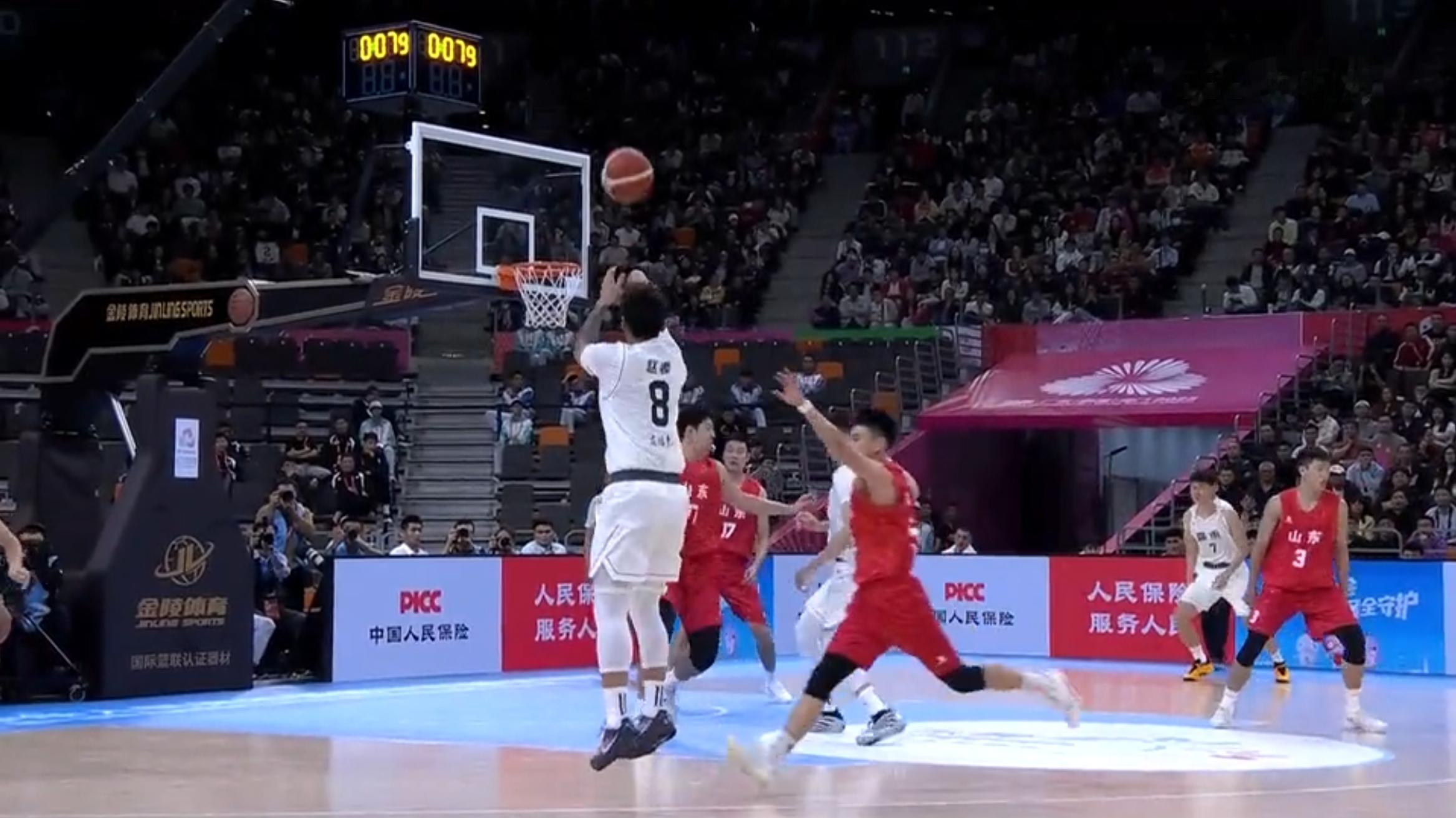 第三节,赵睿连续得分,带领广东队打出来一个18-9小高潮后,最后3秒再次3分出手命中,三节战罢,广东69-53领先。