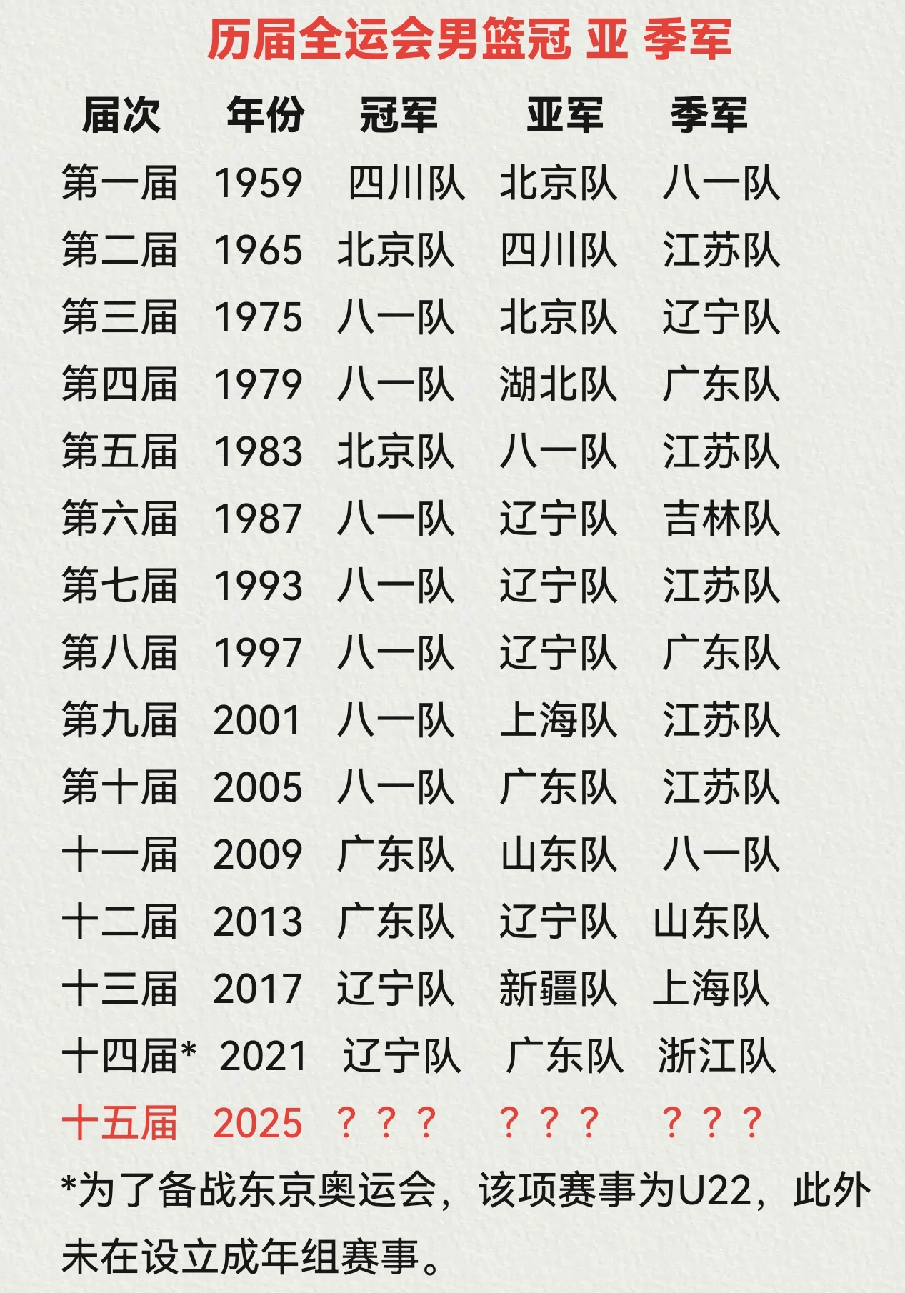 前14届全运会成年男篮比赛,八一队获得7冠1亚3季,辽宁队2冠4亚1季,广东队2冠2亚2季,北京队2冠2亚,四川队1冠1亚。