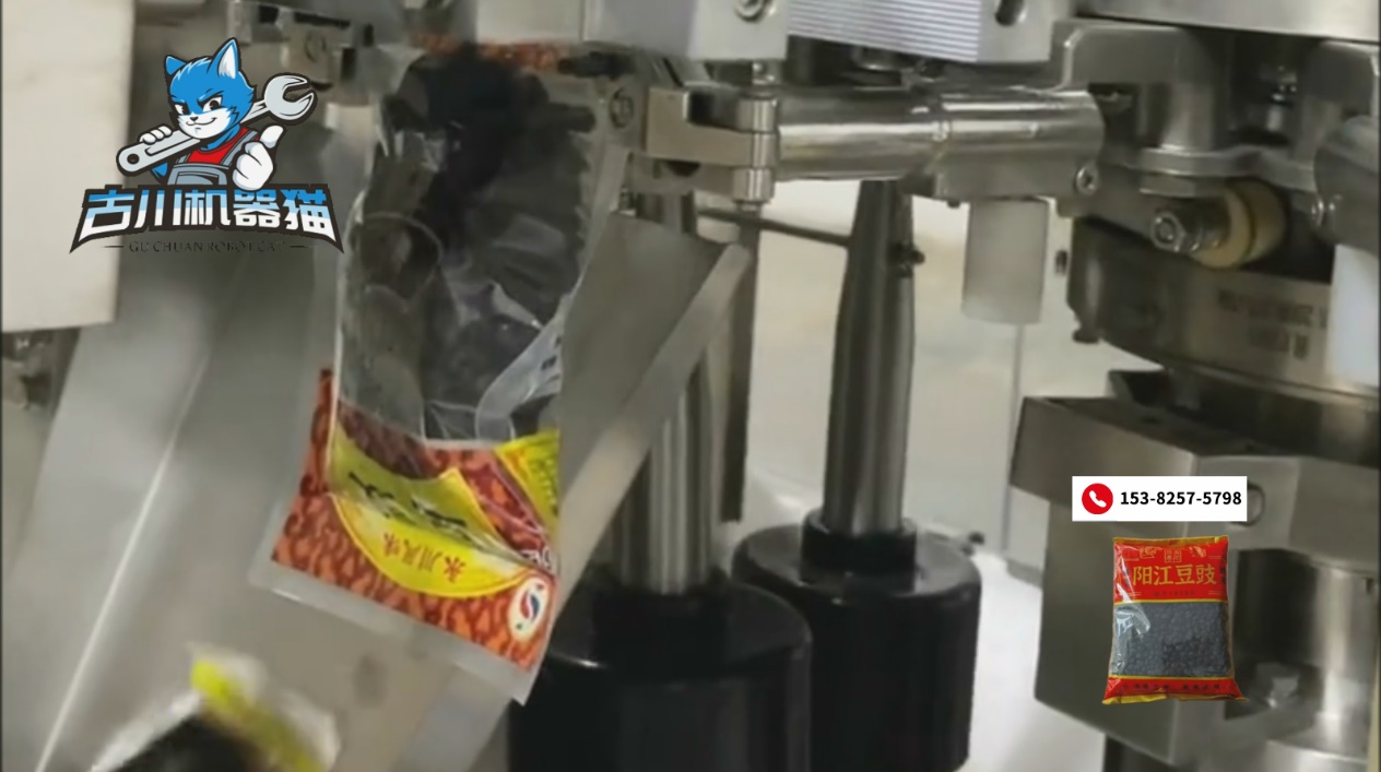 包装豆豉这类“爱黏锅”的调味品,最考验设备的兼容性和稳定性。古川这台机器最大的优点,就是不挑料、适应性强,无论是偏湿的、偏颗粒的、偏粘的,它都能稳稳接住。抓袋精准,计量稳定,封口也利落,能把豆豉这种带汁的小家伙处理得干净利索,不挤汁、不漏料、不污染袋口,看着就让人放心。你甚至能感受到它在包装区那种“我很忙、但我很稳”的工作氛围——虽然快,但不乱。虽然高效,但不飘。