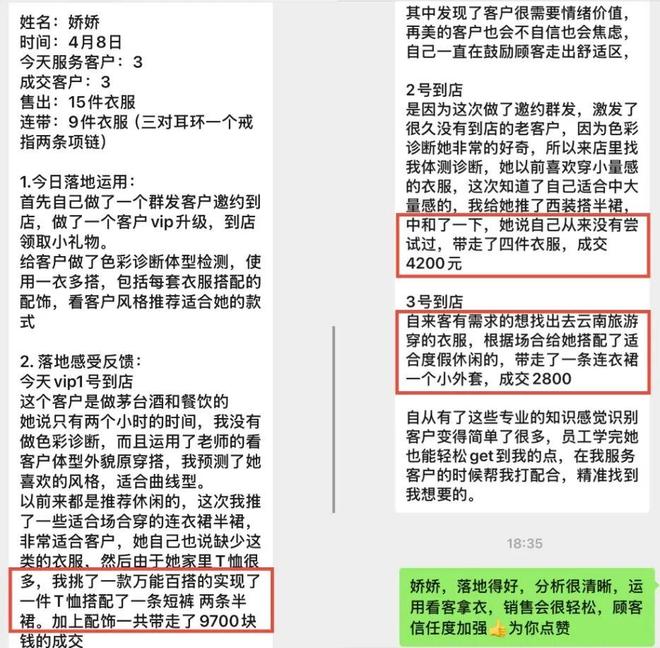 “以前她 喜欢穿小量感的衣服,这次知道了自己适合中大量感的,我给她推了西装搭半裙,中和了一下。成交了4200元。”