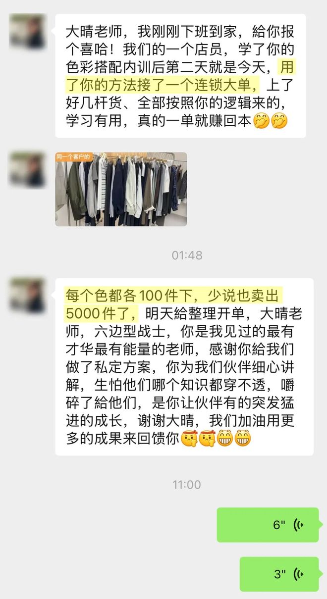 “学完大晴老师搭配内训后,按照老师的方法,接了一个连锁大单:客户下单5000件,一单就赚回本啦!”