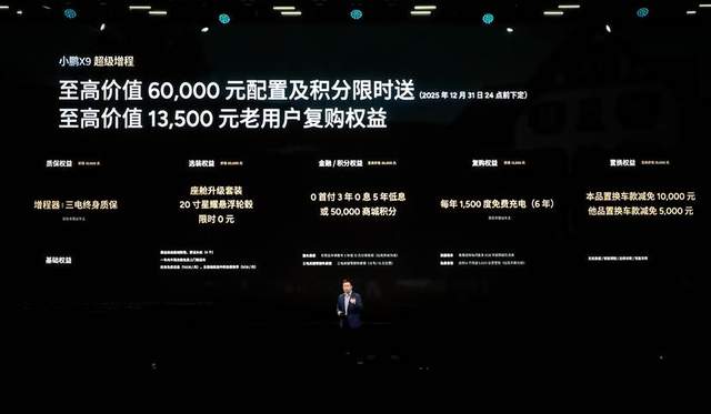 【车市百晓生】2025年11月20日,全球续航最长大七座——小鹏X9超级增程正式上市!新车共推出Max版和Ultra版两个版本,官方指导售价分别为30.98万元和32.98万元。小鹏汽车同步推出多重上市权益及丰富购车礼遇:即日起至2025年12月31日24点前下定,可享受至高价值60000元配置及积分权益:增程器和三电系统终身质保权益价值10000元;座舱升级套装+20寸星耀悬浮轮毂选装权益价值20000元限时免费;0首付3年0利息5年低利息金融权益或50000商城积分权益至高价值30000元。更有老用户还可享受至高价值23500元的复购权益:每年1500度免费充电6年有效期的复购权益价值13500元;本品置换车款减免10000元和他品置换车款减免5000元。