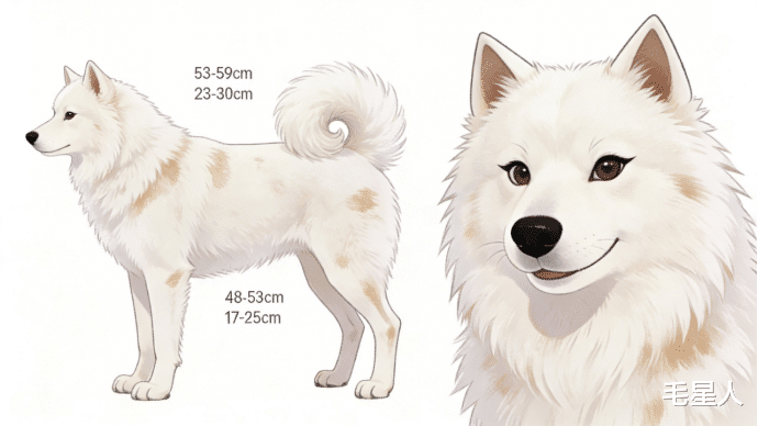 萨摩耶犬属于中型犬种,体型匀称协调,既展现出力量感,又不失优雅姿态。根据AKC官方标准,成年公犬肩高53-59厘米,体重23-30公斤;成年母犬肩高48-53厘米,体重17-25公斤。整体身体呈长方形,背部平直,胸部宽阔,肌肉线条流畅,行走时步伐稳健轻快,尽显活力。