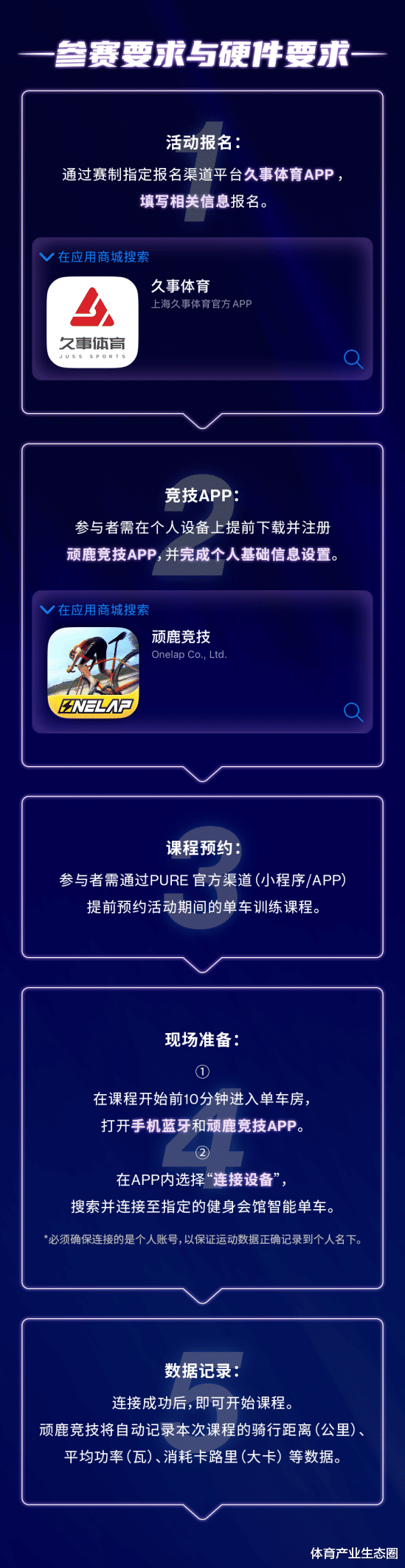 本次活动参与对象为PURE健身会馆现有成员以及活动期间新入会的成员。会员可通过指定报名平台久事体育APP填写信息完成报名,下载相应骑行软件后,通过PURE官方渠道提前预约活动期间的单车训练课程即可参与到活动当中。