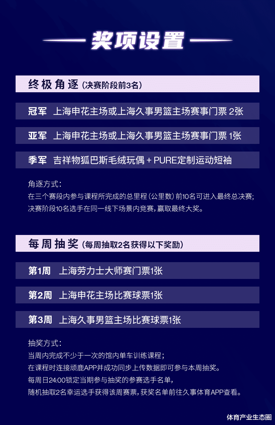 本次活动设置多重奖励机制,让运动活力与惊喜并肩。活动期间每周将会为完成训练课程的参与者中随机抽取2位幸运者,送出上海劳力士大师赛、上海申花主场以及上海久事大鲨鱼男篮主场赛事门票(每周奖品不同)。