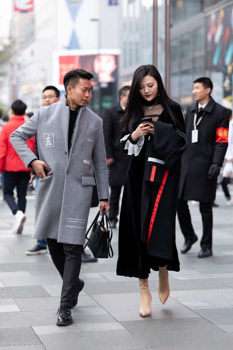 女士的黑色长裙优雅又神秘,蕾丝与灯笼袖的设计增添了一丝浪漫与甜美。外搭黑色长外套,气场十足。搭配的裸色高跟短靴,不仅拉长了腿部线条,还为整体造型增添了一份温柔与优雅,两人走在一起,般配又吸睛。