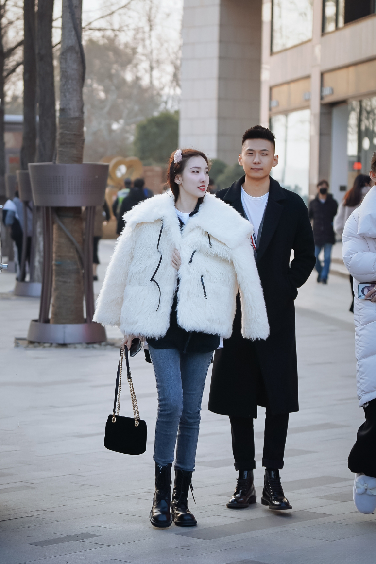 女士的白色毛绒外套简直太可爱啦!毛茸茸的材质摸起来柔软,看起来温暖又甜美。搭配蓝色牛仔裤和黑色短靴,中和了毛绒外套可能带来的臃肿感,显得青春又活力,是甜美女孩的出街必备。