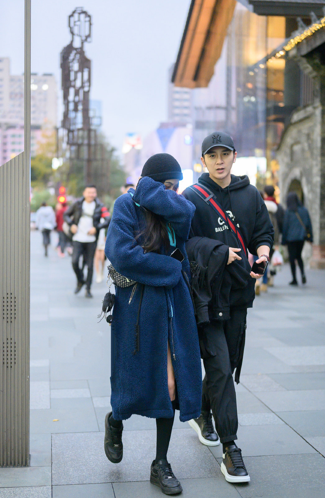 男士的格子大衣经典又复古,搭配黑色西装裤和棕色皮鞋,尽显绅士风度。女士的黄色毛绒外套搭配黑色短裙和黑色短靴,温柔又时尚。两人走在一起,形成了独特的时尚风景线。