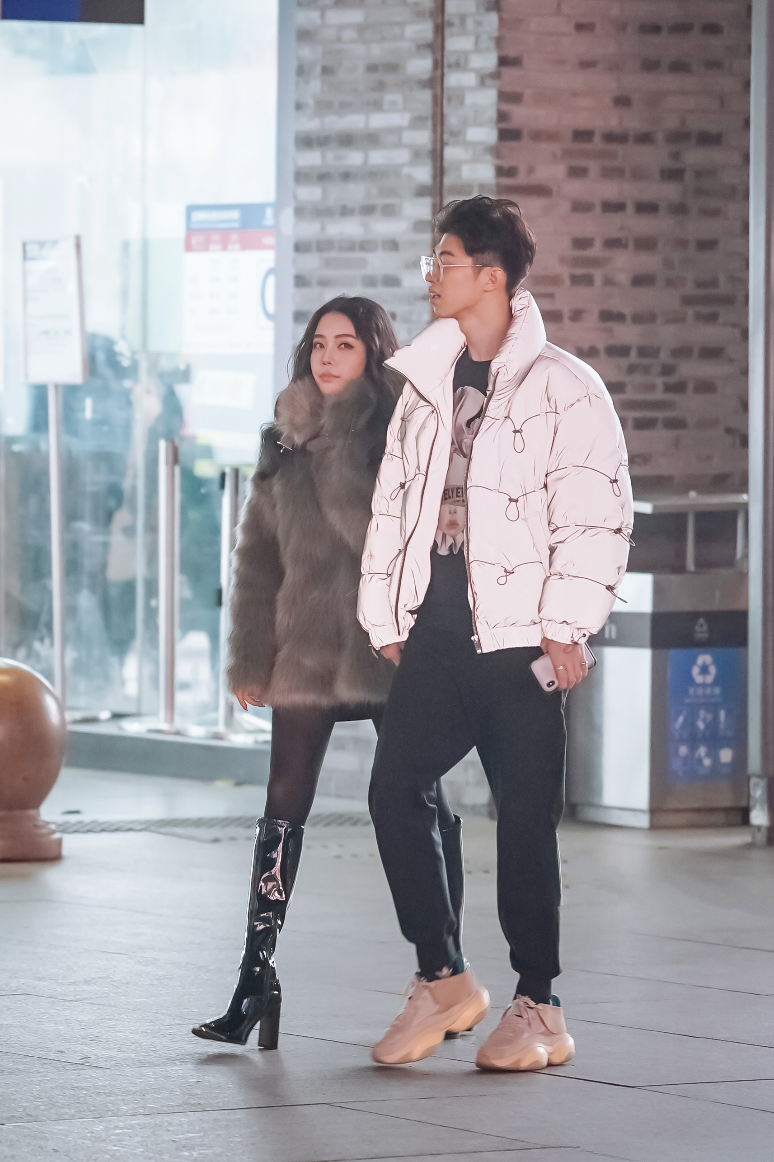 两人都穿着花色的棉服和裤子,个性十足,走在街上回头率超高。男士的银色花棉服搭配黑色内搭,女士的黑色花棉服搭配红色花裤子,色彩搭配大胆又独特,展现出两人独特的时尚品味。