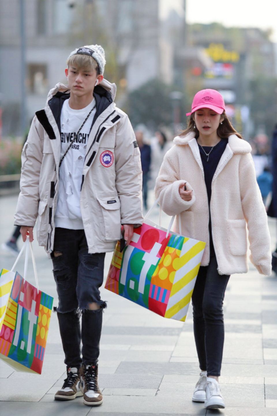 男士的浅色工装外套搭配破洞牛仔裤,休闲又有个性。女士的白色毛绒外套搭配黑色紧身裤和白色运动鞋,甜美又舒适。两人手提彩色购物袋,为整体造型增添了一份活泼与趣味,是购物出街的绝佳穿搭。