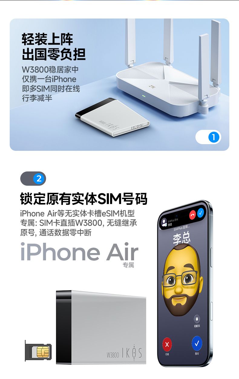 针对iPhone Air等采用eSIM技术、无实体卡槽的机型,IKOS W3800提供了专属解决方案:只需将实体SIM卡直接插入设备,即可让原号码在iPhone上继续使用,实现通话与数据业务的平滑衔接,体验全程无感切换。
