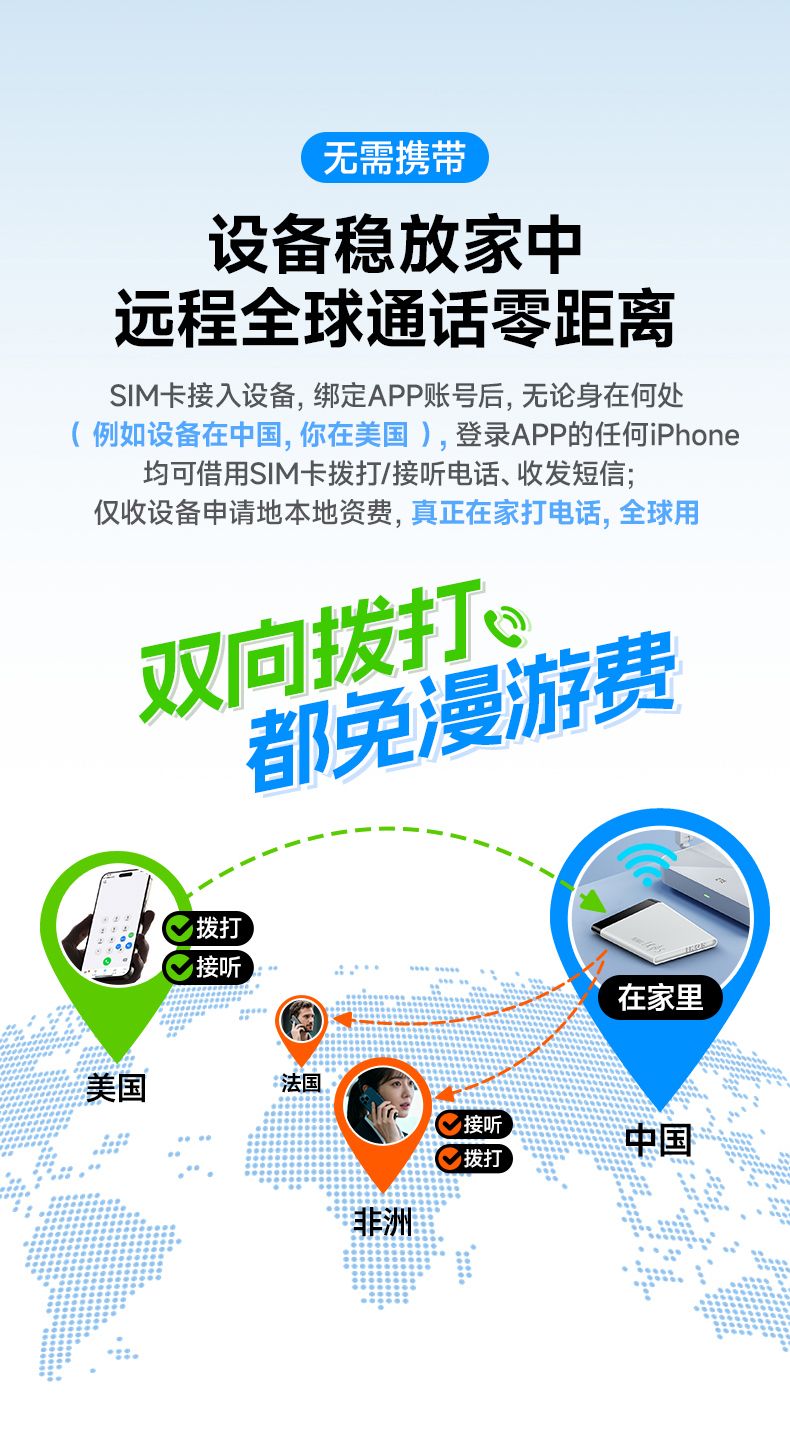 无论你身处纽约、巴黎还是东京,只要将SIM卡置于国内家中的W3800设备里,通话和短信都会按照该SIM卡在中国大陆的本地套餐计费。跨国通话同样清晰流畅,费用却与在家通话无异,真正实现“全球通话,本地付费”。