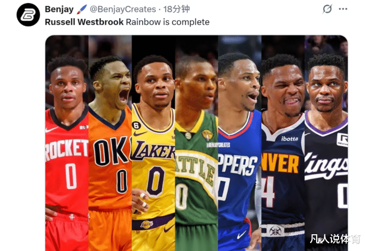 北京时间 10 月 16 日,据名记 Shams Charania 报道,九届 NBA 全明星、历史三双王拉塞尔 - 威斯布鲁克已同意加盟萨克拉门托国王队。这将是威少 NBA 职业生涯效力的第 7 支球队,也让这位 36 岁的老将再次成为联盟焦点。美媒纷纷发文调侃,称威少已经集齐了 "彩虹球衣",而他的加盟也让国王队的实力得到了显著提升。