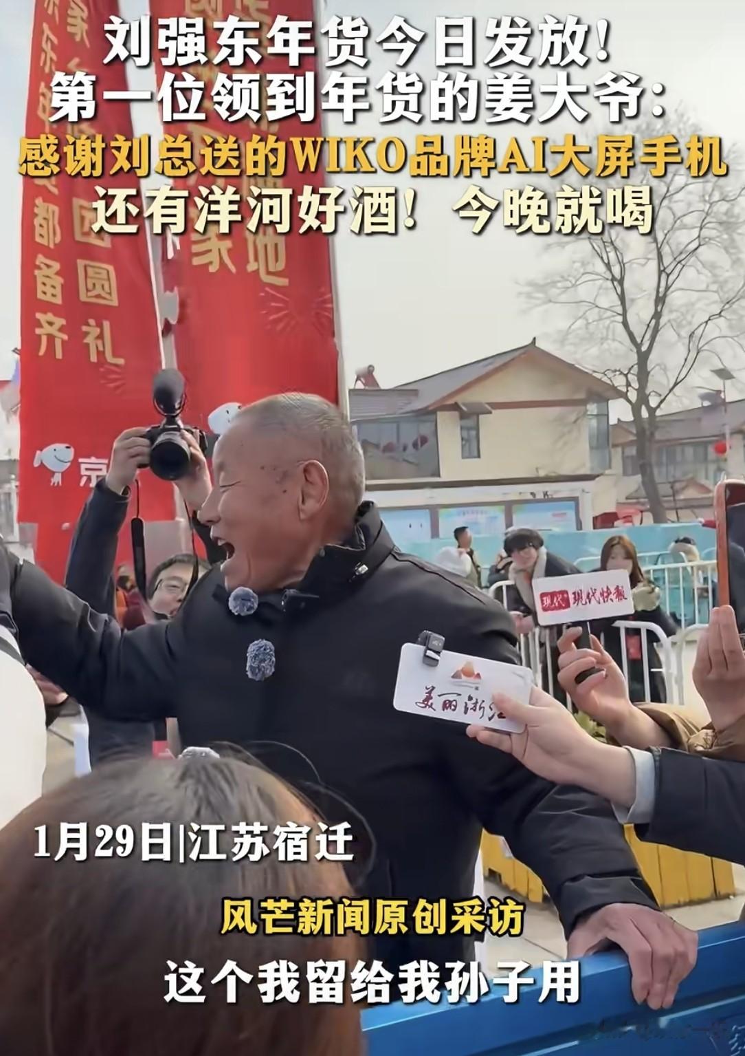 领到的村民都直说,东哥想得太周到了!年货足足30多样,啥都有:老人用的血糖仪、护腰带,大人用的微波炉、白酒,小孩的零食玩具,还有最新的手机,一位大爷捧着白酒笑哈哈:“这酒今晚就喝,手机留给孙子用!”大家都是推着三轮车来拉,东西多到数不过来,嘴里还不停念叨“感谢大强子”。