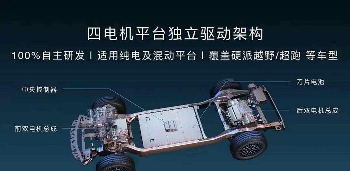 传统方案:哪怕是仰望U8这类四电机车型,其电机都布置在前后车轴之间,通过半轴将动力传递到车轮。这是一种“中央部署,动力分发”的思路。