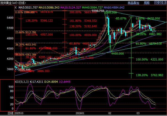 月初连续两周冲高下跌后,当前依然保持弱势,4960-70暂时支撑,主要是日内严重超卖,目前逐步修复。接下来,继续关注5和10日线和趋势阻力,2025年几乎一整年依托均线上行,当前破位,先看压力;向上突破,短期走强。下方4960-70多次支撑上扬,这里依然关键,进一步4920-4850和60日均线区域;然后大三角下边缘和2月份次低点4650-4700美元和2月份低点4500美元下方。