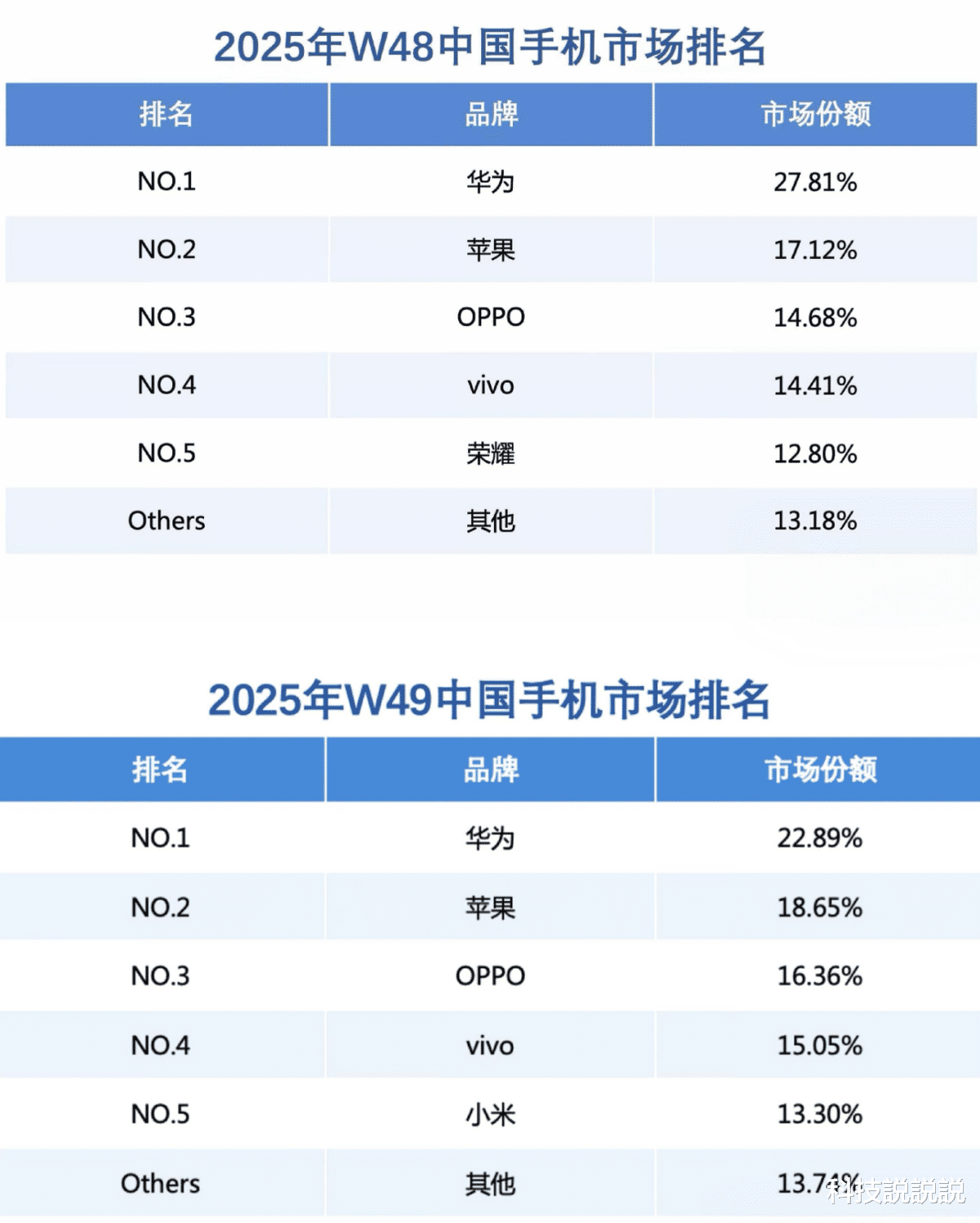 不仅如此,在2025年第48周与第49周,凭借华为Mate 80系列持续火爆的销量带动,华为手机的市场份额分别达到27.81%和22.89%,以显著优势连续两周超越苹果,稳居国内市场份额第一。这不仅标志着华为在高端市场的强势回归,更意味着时隔多年,国内手机市场再次形成 “华为 vs. 苹果”双雄争霸的竞争主旋律。
