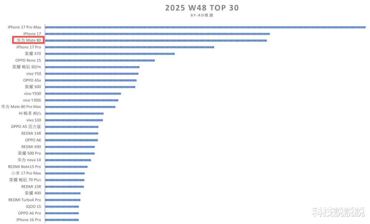 近日,国内手机市场格局迎来了一次标志性变动。根据最新公布的权威市场监测数据显示,在2025年第48周的销量榜单上,华为Mate 80强势跻身前三,一举打破了自2025年9月以来苹果iPhone 17系列长期垄断单周销量前三的固有格局。
