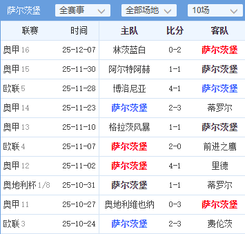· 萨尔茨堡的客场与状态:萨尔茨堡在本赛季欧联杯中表现挣扎,客场战绩尤其糟糕(两战全败,共失6球)。虽然上周末在国内联赛取胜,但欧战赛场近期1-4惨败给博洛尼亚的经历,可能会影响球队士气。