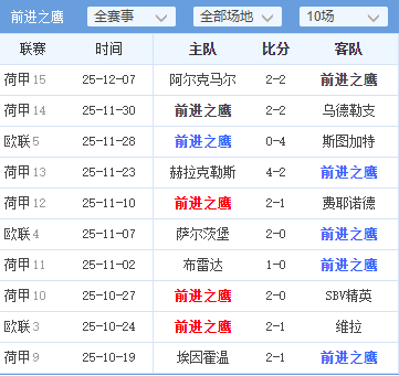 · 前进之鹰:欧战进攻乏力(场均仅0.8球),防守端问题较大(场均失1.8球)。球队近期状态持续低迷。