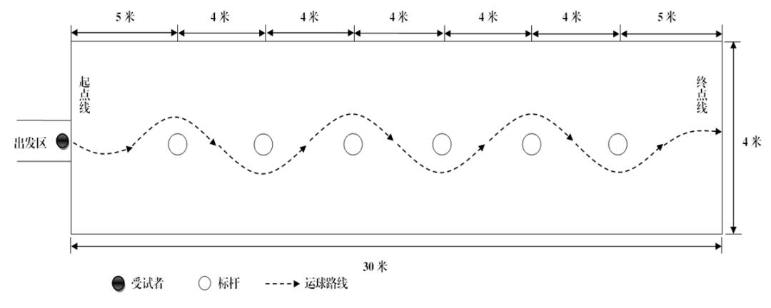 设置要求如下:长30米,宽4米,场地四周设置明显的标志线。起点线前5米处开始设置标志杆,标志杆与两侧边线相距2米,共设6根,各杆之间相距4米。