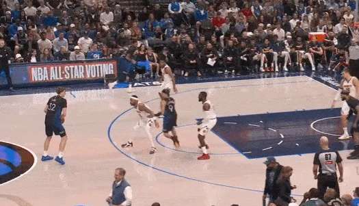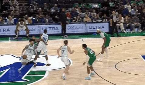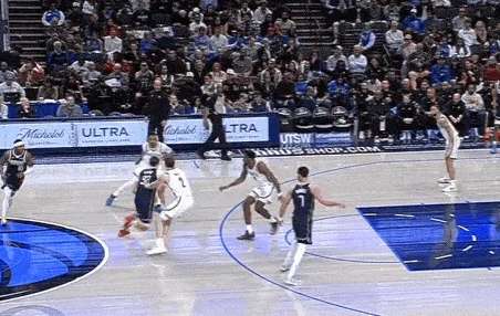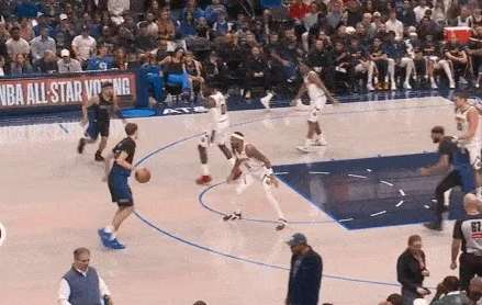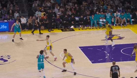 转换进攻回合弗拉格见小内姆难以传给内线要到错位的浓眉,迅速空手上提接应,接球后见克劳尼处于自身左侧直接推球变向启动右路突