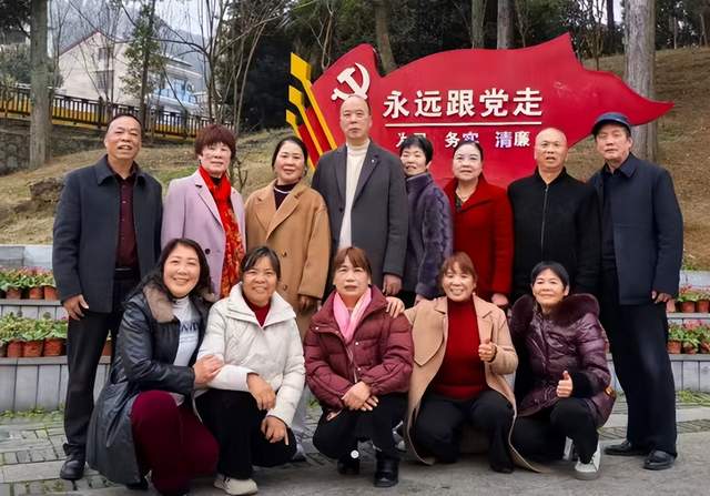 林间的风,拂过挺拔的树,也拂过“永远跟党走”那面鲜红的旗帜。字里行间的赤诚,在岁月里沉淀成最厚重的底色,与身后葱郁的山林、错落的屋舍,共同织就一幅烟火与初心交织的画卷。