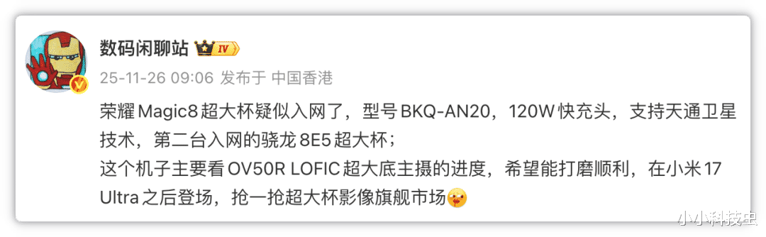 11月26日,博主"数码闲聊站"放出消息,荣耀Magic8超大杯(型号BKQ-AN20)八成是入网了。